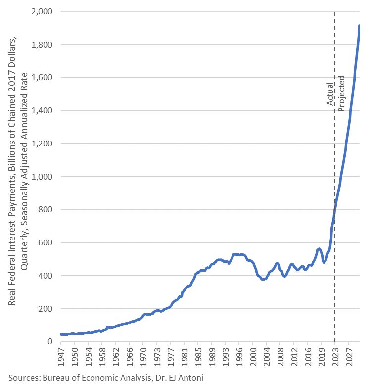 Interest on the debt is growing as old cheap debt matures and gets refinanced at the new higher rates. Plus new debt added every year.