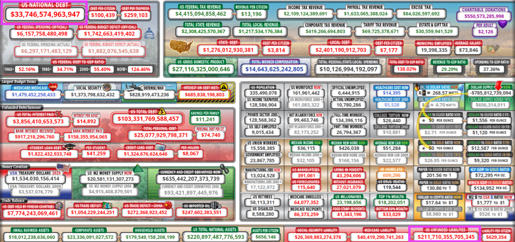 Yes, US national debt is at $33.75 trillion and growing awfully fast. Of course, that is small potatoes compared to the $211.7 TRILLION in unfunded Federal promises (entitlements). That means that unfunded promises are 6.27 times the current national debt. There isn’t enough taxable income from individuals to pay for the promised entitlements.