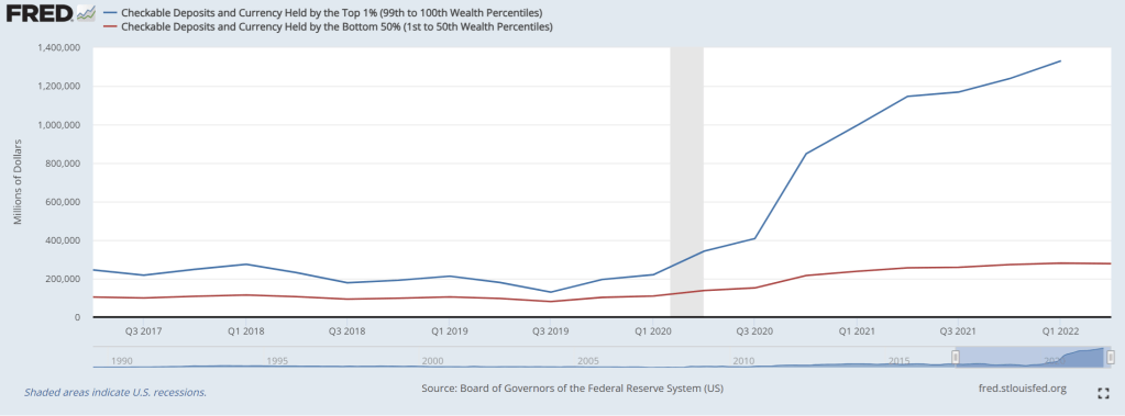 Even checkable deposits and currency held by the top 1% (call it the Kerry Class after multi-millionaire and Statist parasite John Kerry, Biden’s climate “envoy”) are soaring while the bottom 50% are seeing only a tepid rise.