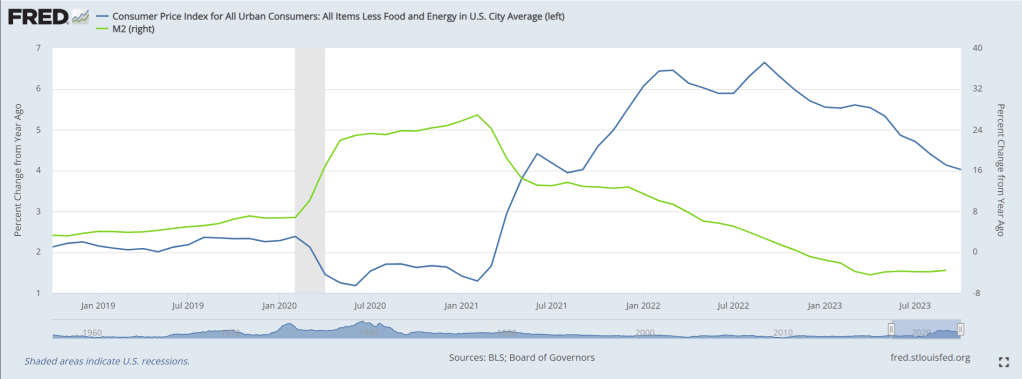 Being politicians, The Biden Administration take credit for RECENTLY declining prices, but failing to mention that declining prices have more to do with declining M2 Money growth (now -3.6% YoY) after the enormous burst in Federal spending with Covid.