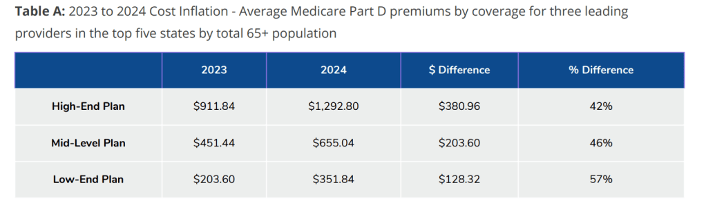Bottom line? Retired Americans enrolled in Medicare’s Part D prescription coverage could see their premiums increase by 42-57 percent in 2024.