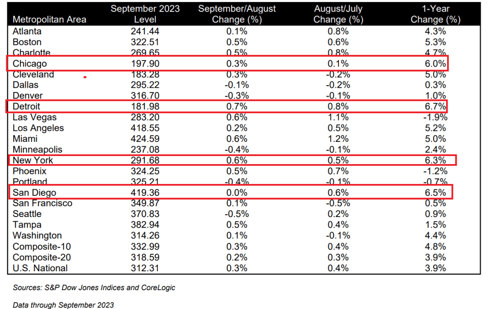 “On a year-over-year basis, the three best-performing metropolitan areas in September were Detroit (+6.7%), San Diego (+6.5%), and New York (+6.3%),” according to Craig J. Lazzara, Managing Director at S&P DJI.