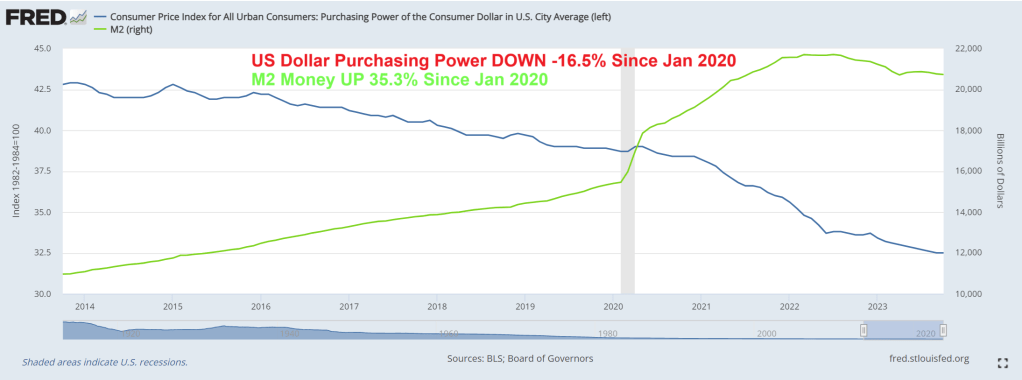 Since Covid and the idiotic government and school shutdowns of 2020, the purchasing power of the US Dollar has fallen -16.5% as M2 Money grew 35.3%. Keep on printing?