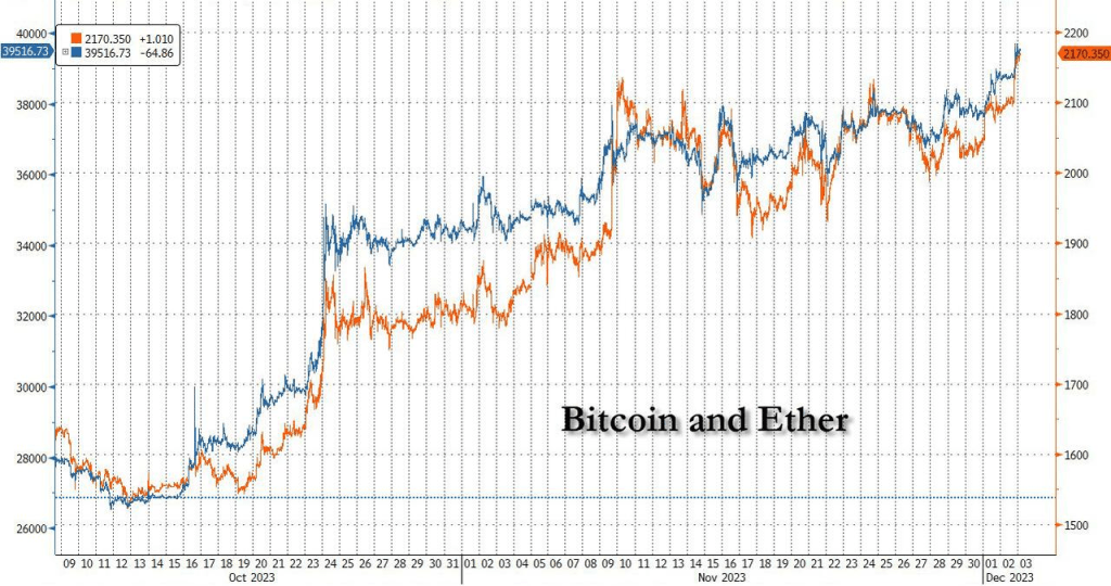 Amid the surging inflows, and amid expectations for imminent ETF approval by the SEC and a surge in March rate cuts odds, bitcoin and ethereum have continued their furious ascent, with the former now trading just shy of $40.