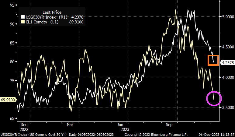 And as US Treasury 30Y yield drop, so do crude oil prices.
