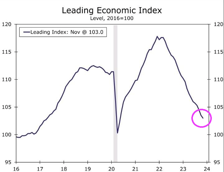 The Conference Board Leading Economic Index® (LEI) for the U.S. declined by 0.5 percent in November 2023 to 103.0 (2016=100), following a (downwardly revised) decline of 1.0 percent in October. The LEI contracted by 3.5 percent over the six-month period between May and November 2023, a smaller decrease than its 4.3 percent contraction over the previous six months (November 2022 to May 2023).