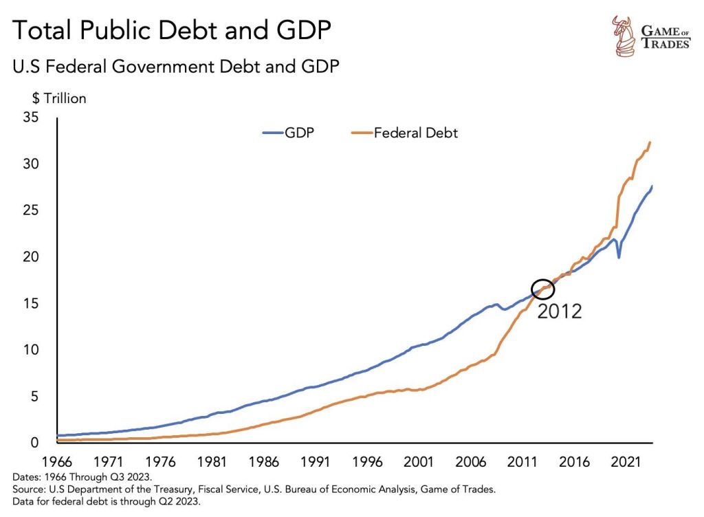 US government debt is now bigger than the US economy. This was unseen until 2012 when debt surpassed GDP for the first time.