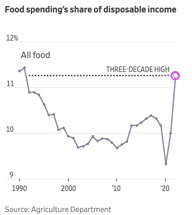 In addition, food spending’s share of disposable income is at its highest in three decades.