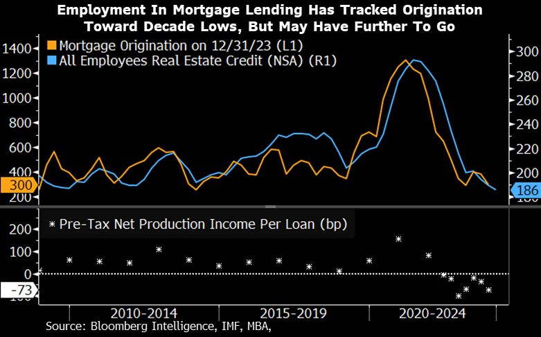 Employment in mortgage lending has shrunk along with collapsing mortgage originations under Biden.