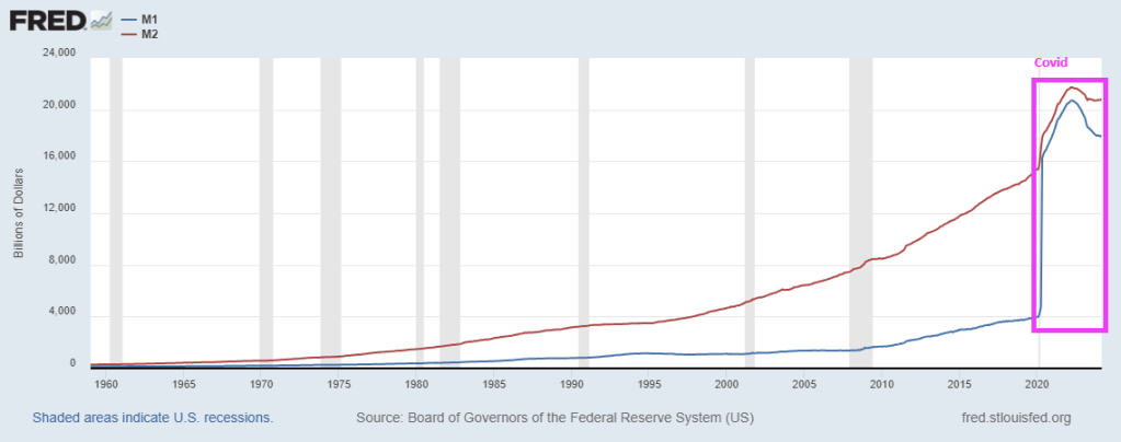 In fact, M1 Money year-over-year (YoY) rose a staggering 360% in February 2021. M2 Money, a broader measure of money, grew at a rate of 26.75% YoY in February 2021. Remember, Biden was sworn in as President in January 2021.