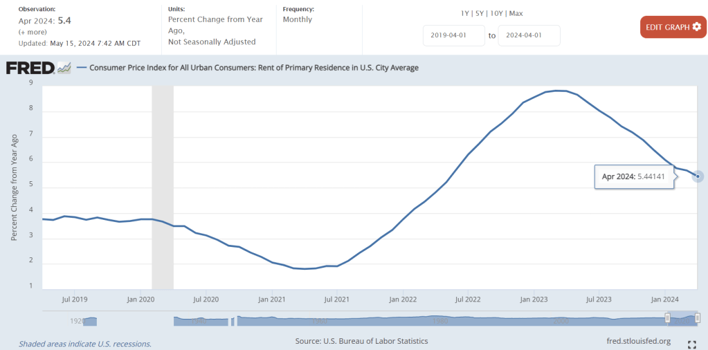 Rent of primary residences rose 5.44% YoY. Bear in mind that rent of primary residences was only 2% when Biden became President. So, rents are still 172% higher under Bidenomics.