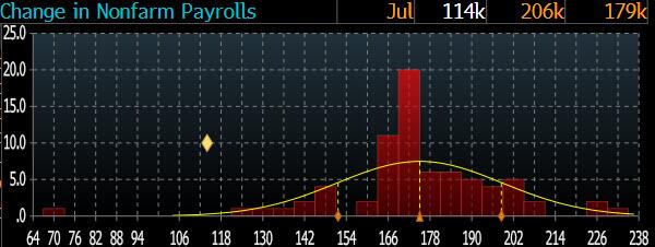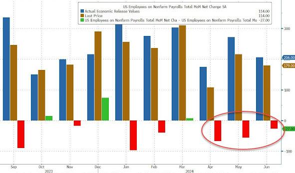 May revised down by 2,000, from +218,000 to +216,000, and the change for June was revised down by 27,000, from +206,000 to +179,000. With these revisions, employment in May and June combined is 29,000 lower than previously reported. It gets better because as shown in the next chart shows, 5 of the past 6 months have now been revised lower.