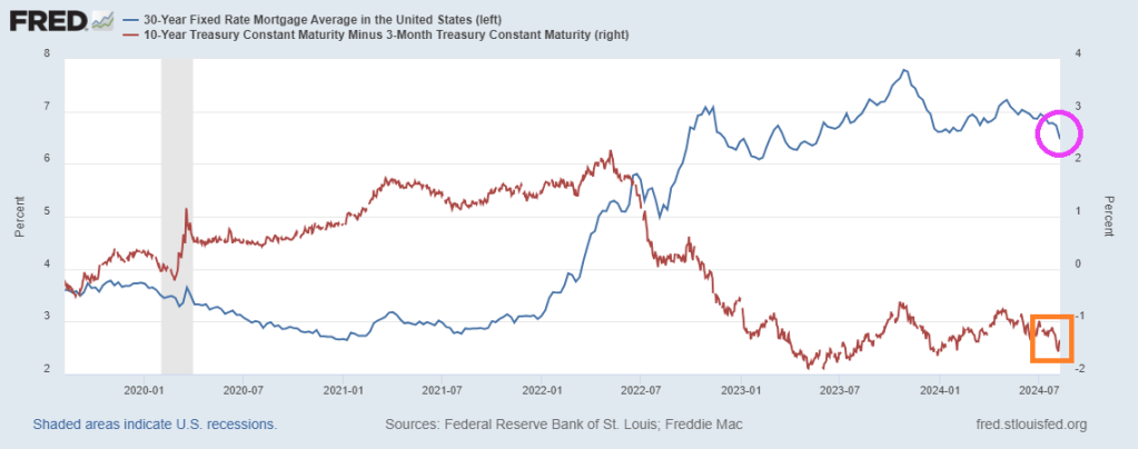 How about the US mortgage rate? Generally, US Mortgage rates are inverse to the 10Y-3M yield curve, but lately the US mortgage rate (pink circle) have declined with the 10Y-3M yield curve.