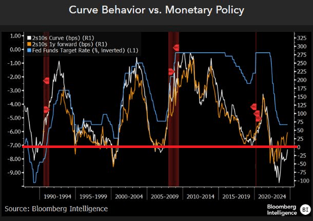 We know several things about the yield curve. First, it goes negative before recessions. Second, it is related to the inverse of The Fed’s target rate (blue line).