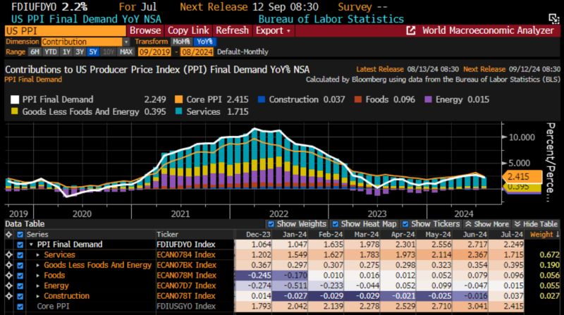 Final demand services: Prices for final demand services fell 0.2 percent in July, the largest decrease since moving down 0.2 percent in March 2023. The July decline can be traced to the index for final demand trade services, which dropped 1.3 percent. (Trade indexes measure changes in margins received by wholesalers and retailers.) In contrast, prices for final demand services less trade, transportation, and warehousing and for final demand transportation and warehousing services rose 0.3 percent and 0.4 percent, respectively.