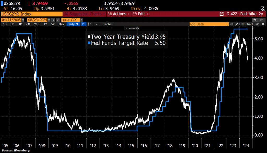 US 2y yields plunge to 3.95% as Fed’s Powell says ‘time has come’ to cut interest rates. Says Fed doesn’t seek, welcome further cooling in labor market.