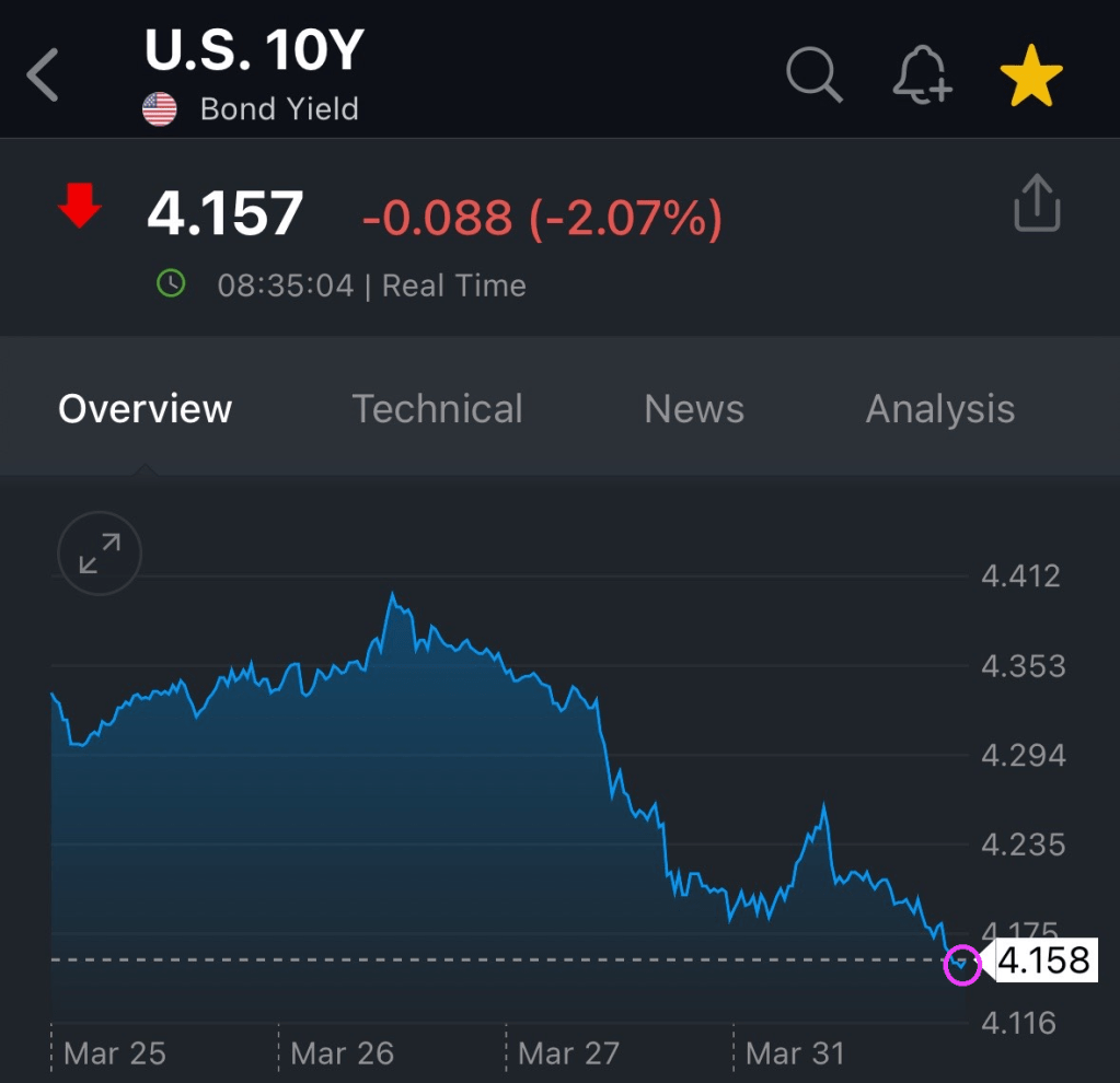 The US Treasury 10Y yield has fallen to 4.157% as recession fears mount.