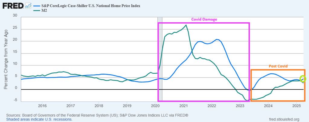You can see the damage to homeownership caused by Covid and The Fed. The massive expansion of M2 Money in 2020 was followed shortly by rapid increases in home prices. This was followed by a normalization in Fed M2 Money printing. Consequently, home price growth has slowed.