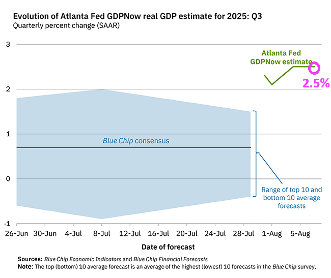 The GDPNow model estimate for real GDP growth (seasonally adjusted annual rate) in the third quarter of 2025 is 2.5 percent on August 7, unchanged from August 5 after rounding. After this morning’s wholesale trade report from the US Census Bureau, the nowcast of the contribution of inventory investment to third-quarter real GDP growth increased from 0.76 percentage points to 0.82 percentage points.