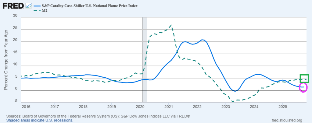 Housing price growth has stalled even though M2 money growth is higher YoY.