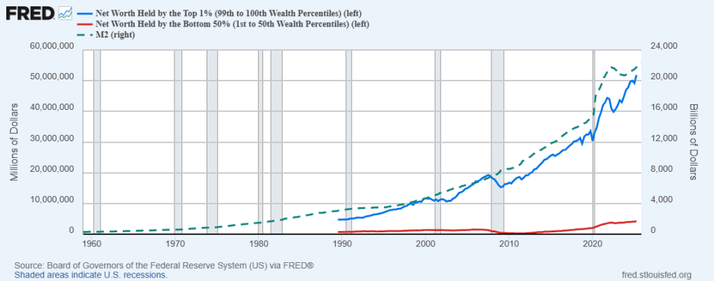 The Federal Reserve prints a lot of money (M2). Unfortunately, it largely benefits elites (the top 1%). The bottom 50% get some benefits, but the gains in net worth largely benefits the elite class.