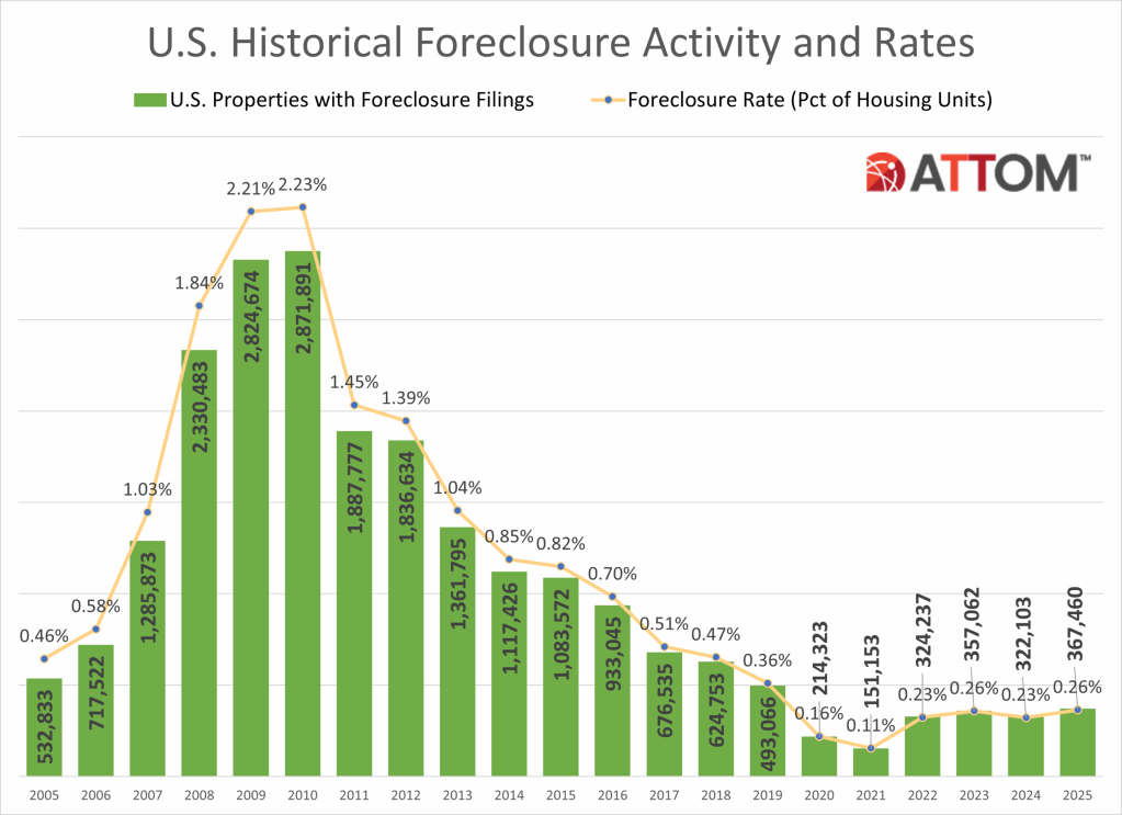 Lenders started the foreclosure process on 289,441 U.S. properties in 2025, up 14 percent from 2024, up 213 percent from the pandemic-era low in 2021, but down 14 percent form 2019 and down 86 percent from a peak of 2,139,005 in 2009.