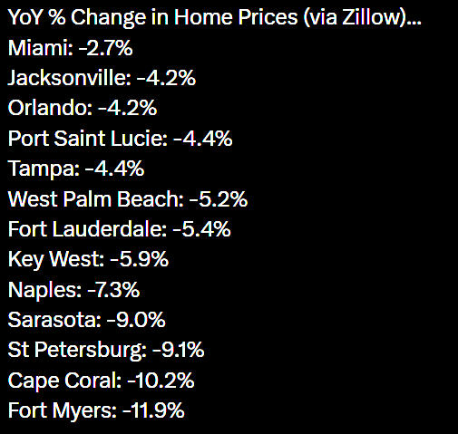 Florida home prices are tanking with Fort Myers leading the collapse at -11.9% YoY.