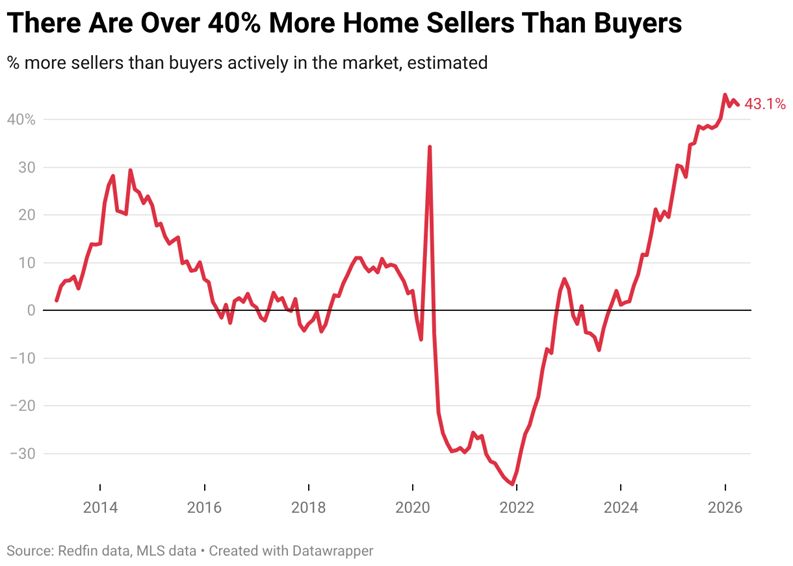 Per Redfin, home sellers outnumbered buyers by 43.1% in March…up from 28.0% a year ago but shy of December’s 45.2%, which was largest gap on record.