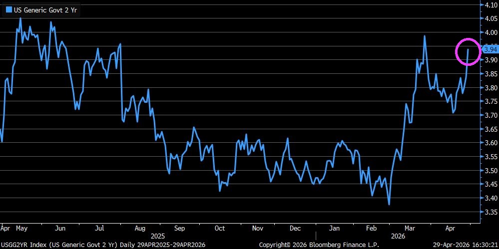 Yesterday’s Fed meeting left interest rates unchanged but 2y Treasury yield jumped 10bps to 3.94%.