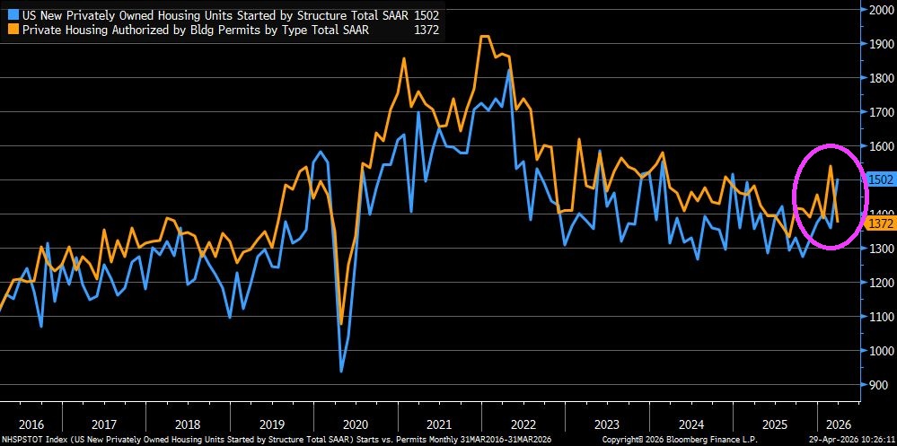 March housing starts hit their highest level since December 2024 but permits fell sharply to a seven-month low.