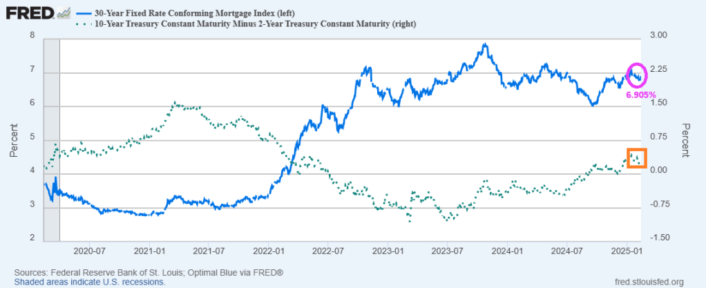 Note that on the left=hand side of the above chart that the US Treasury yield curve slope (green dashed line) hit its local high as Joe Biden became President, then began to decline as the insane spending ensued. Mortgage rates started to rise in 2022 as the yield curve slope declined.