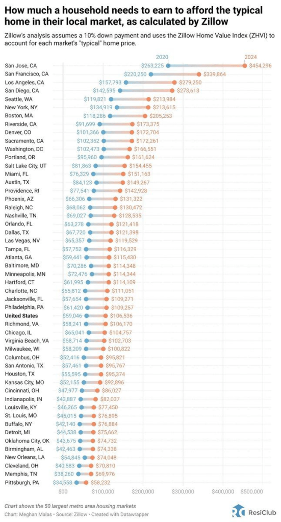 Of course, tech town San Jose and San Francisco lead the nation in income needed to afford a typical home in a market. Los Angeles and San Diego are third and fourth, followed by Seattle. Pittsburgh PA has a lowest income to afford a home, probably because they signed Russell Wilson AND Justin Fields at QB.