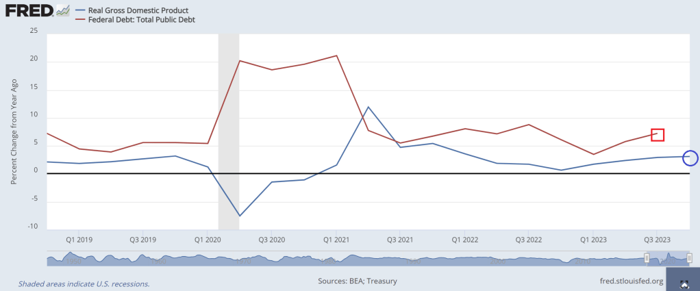 I watched Tucker Carlson’s interview with Russian President Vladimir Putin. Putin is an amazing contrast to our 81-year old President with dementia who can barely speak while Putin was articulate. Not at all what Hillary Clinton was raving about (she is still furious about losing to Trump after losing to Obama). One thing that caught my attention was Putin talking about The Fed’s endless printing of money. Well, THAT is how the US grows GDP these days. Borrow and spend with the private sector as an after thought.