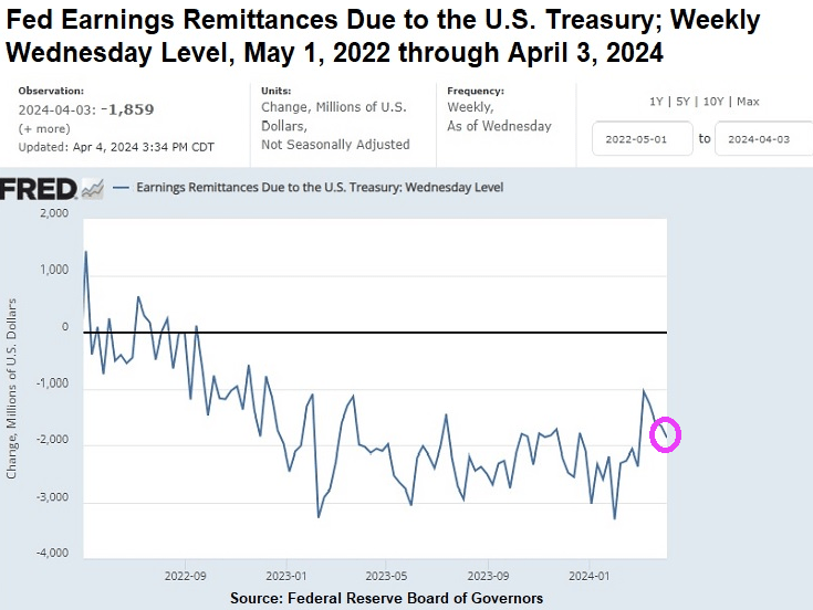 As the chart above indicates, the Fed’s ongoing weekly losses have ranged from a high of $3.3 billion for the week ending Wednesday, January 31, 2024, to $1.86 billion for the most recent week ending Wednesday, April 3, 2024.