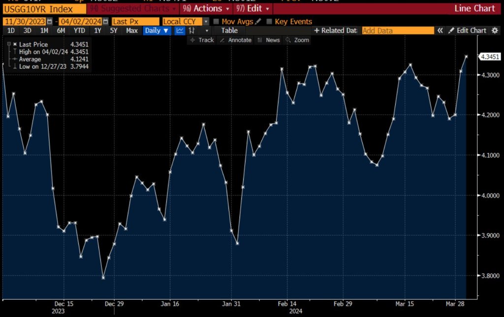 Second, the US Treasury 10-year yield is up tp 4.35%, the highest in 2024.