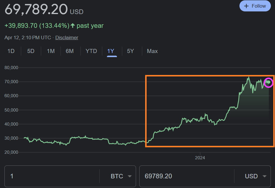 Bitcoin is almost at $70,000 and is up 133.44% over the past year.