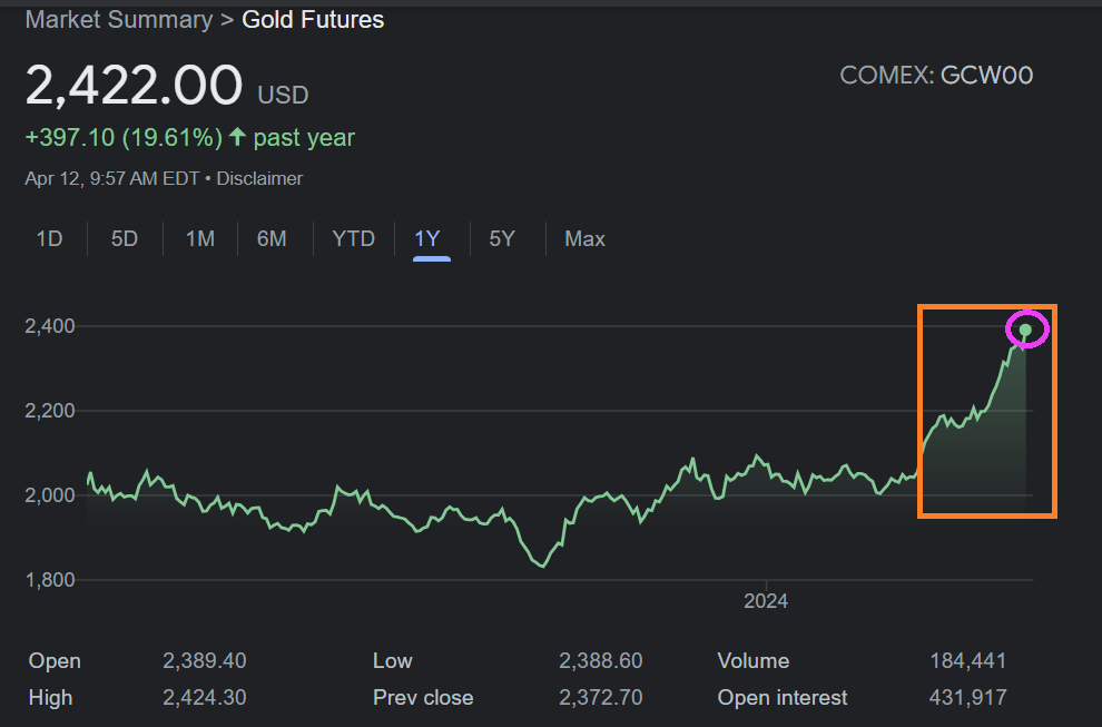 Gold futures prices are soaring and are at $2,422.00. Gold futures prices are up 19.61% over the past year.