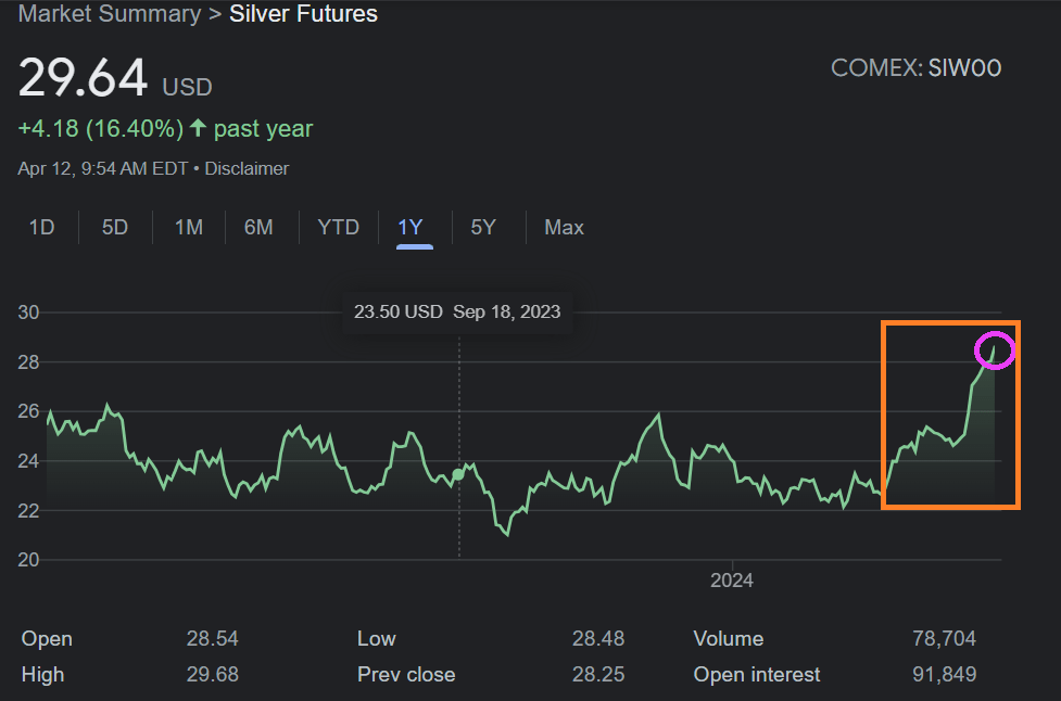 Silver futures prices are also soaring and are at $29.64. Silver futures prices are up 16.40% over the past year.