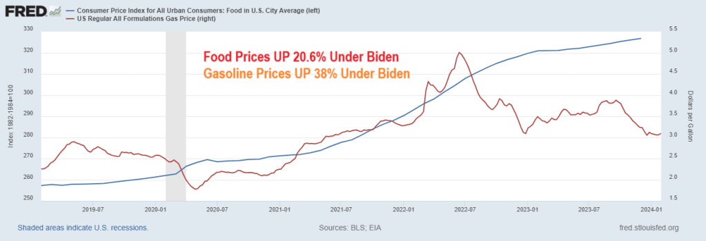 But the rest of us in America are suffering from Bidenomics and inflation. Like food prices having risen 21% under Biden, gasoline prices UP 38%, home prices UP 33.2% and mortgage rates UP 154%.