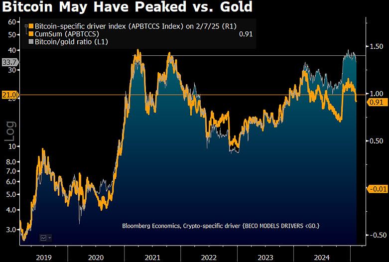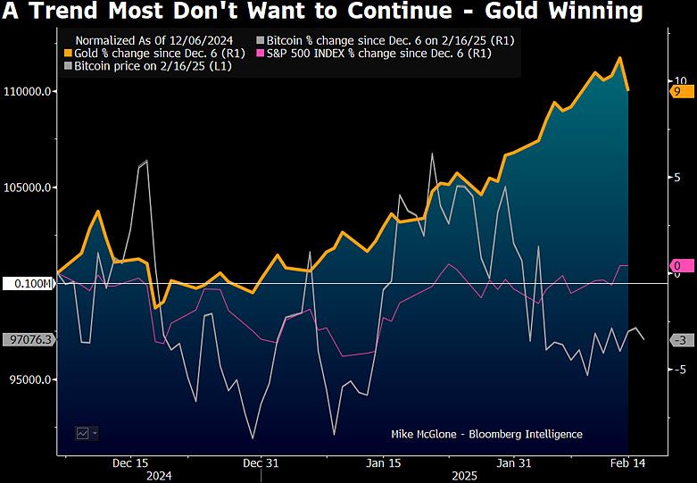 Bitcoin approaching $150,000 in 2025 might suggest another $12+ trillion year of US stockmarket wealth creation, inflation and Fed tightening. Heading toward $50,000 could coincide with some typical deflation following the inflation and put the Fed at ease. Up about 10% since Bitcoin first closed above $100,000, gold may sniffing out a bit of risk-asset normalization. So it appears gold is winning.
