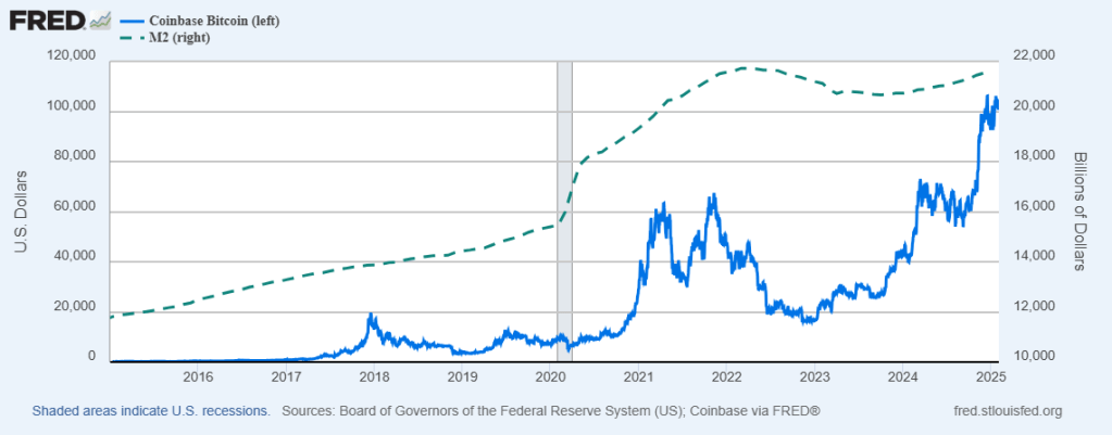 On the US side, M2 Money has increased 12.7% under reckless spending Joe Biden while Bitcoin has increased 249%.