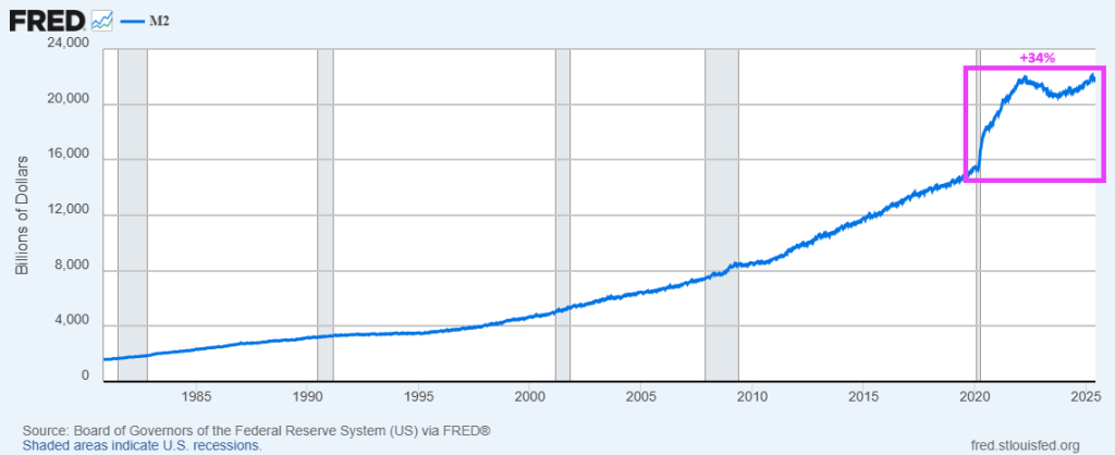 Covid, the gift that keeps on giving. Government spending grew enormously with Covid in 2020. As a result, M2 Money has grown 34% just since 2020.