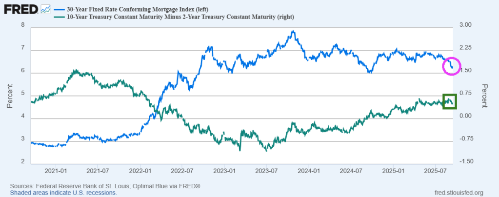 Mortgage rates have fallen since October 23, 2023 as the yield curve has gradually steepened.