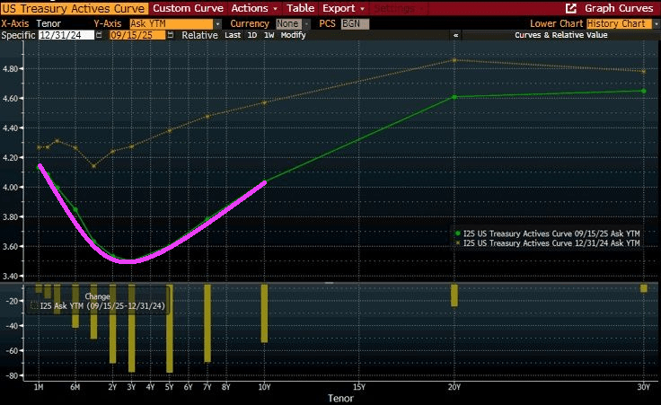 But the reality is the the bond market is expecting declining short-term rates, but not much change at the 10-year tenor.