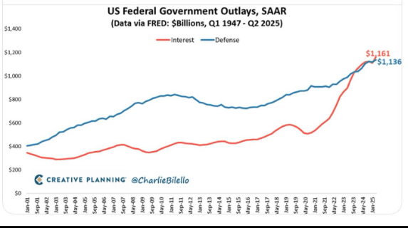 As of Q2, interest payments on the national debt exceeds spending on defense.