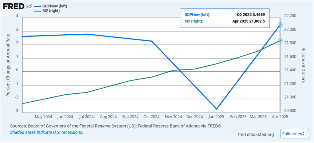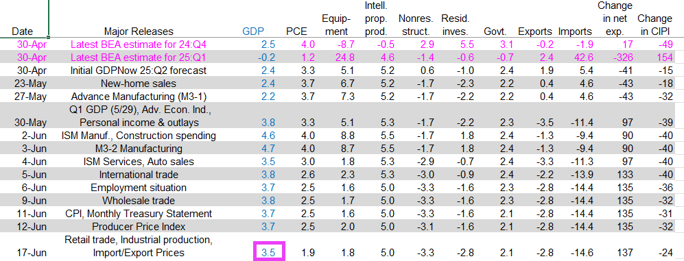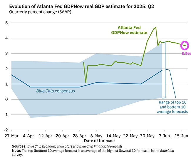 The GDPNow model estimate for real GDP growth (seasonally adjusted annual rate) in the second quarter of 2025 is 3.5 percent on June 17, down from 3.8 percent on June 9. After recent releases from the US Census Bureau, the US Bureau of Labor Statistics, the Federal Reserve Board of Governors, and the Treasury’s Bureau of the Fiscal Service, the nowcasts of second-quarter real personal consumption expenditures growth and second-quarter real government expenditures growth decreased from 2.5 percent and 2.3 percent, respectively, to 1.9 percent and 2.1 percent, while the nowcast of second-quarter real gross private domestic investment growth increased from -1.9 percent to -1.4 percent.