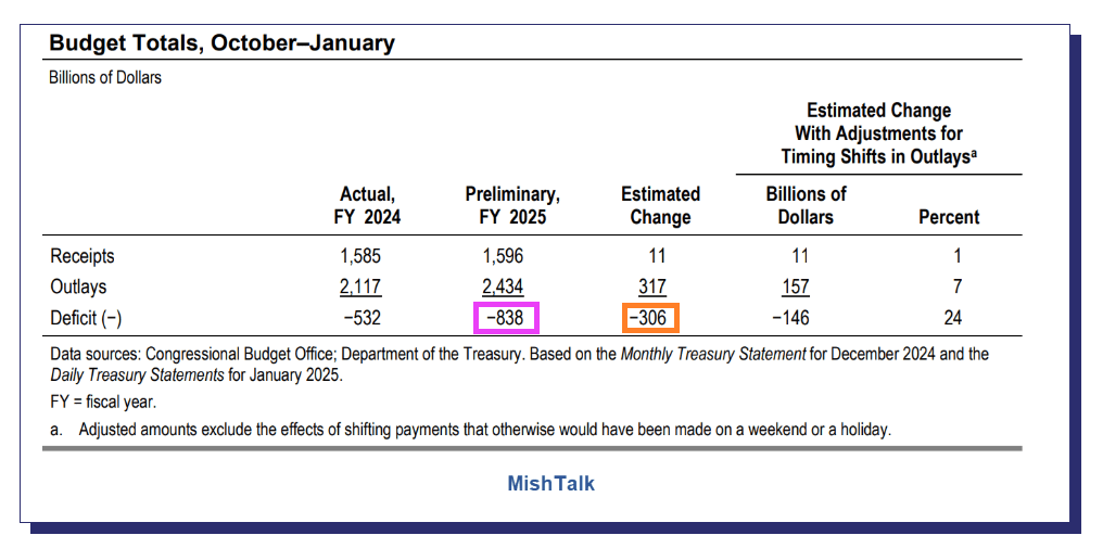 The US deficit for the first four months of fiscal Year 2025 is $838 billion, up $306 billion. Adjusted, the increase is more like $157 billion to $225 billion.