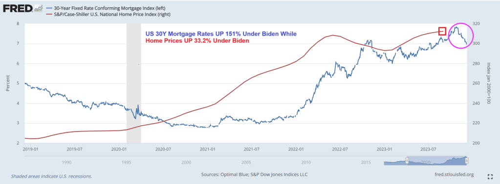 Mortgage rates, despite coming down recently, are still up 151% under Biden. And home prices are up 33.2%. So much for affordable housing for those renting.