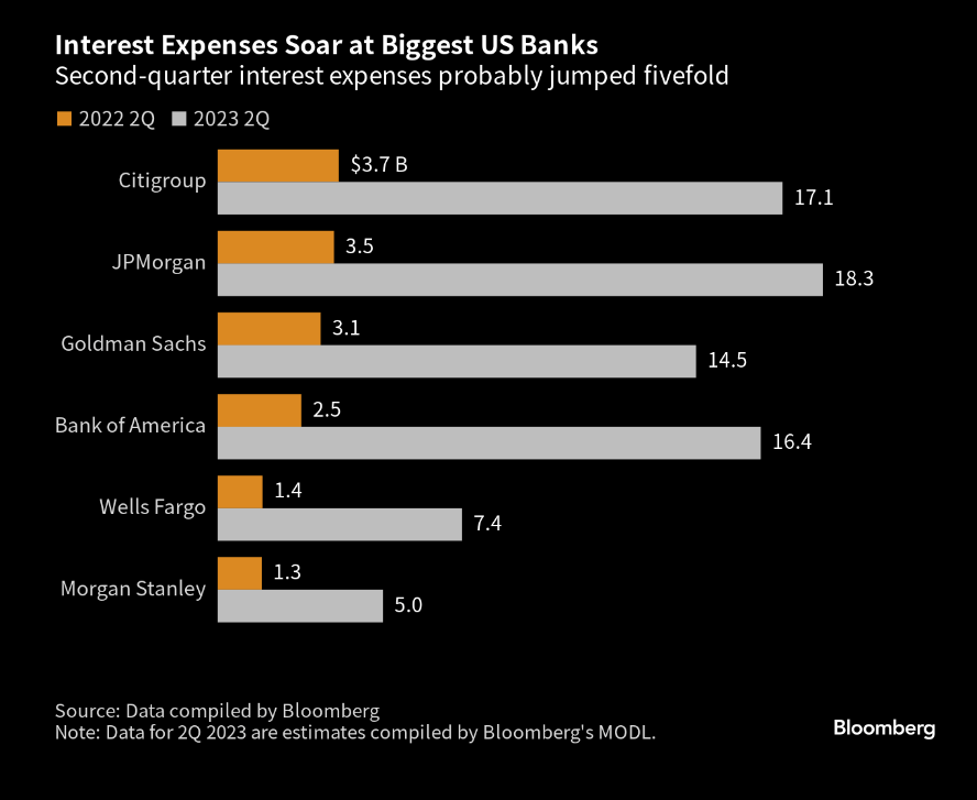 Interest expenses at big US banks are rising much more quickly than interest income. Across the six largest US banks, interest expenses are set to climb to roughly $78.7 billion from $15.5 billion in the same period last year.