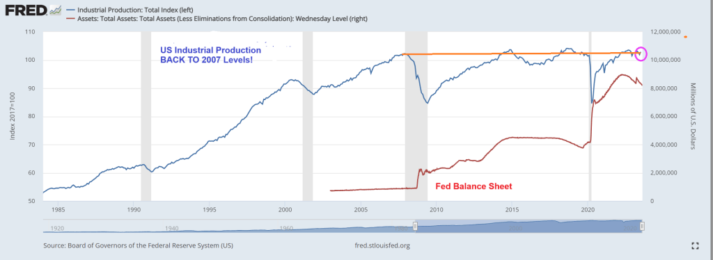 At the same time, US industrial production is at the same level as pre-financial crisis (2007). Despite Federal Reserve monetary stimulypto (remember, The Fed’s balance sheet remains abouve $8 trillion.